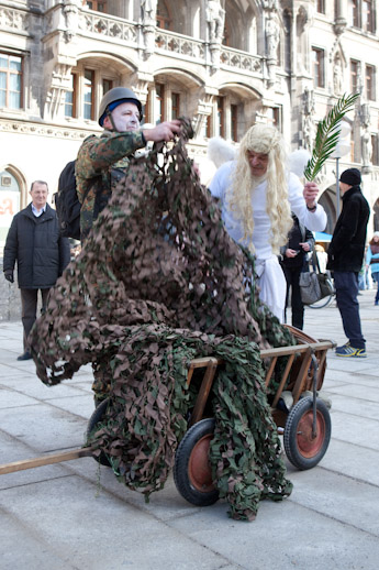 Vom Valentinmusäum wird ein jämmerlicher Friedensengel und ein Panzertarnnetz von einem Pazifisten im Kampfanzug in einem Leiterwagen zum Kunstverbotsamt im Rathaus am Marienplatz gezogen. Wie jämmerlich der Friede in München ist, stellte Karl Valentin schon 1915 mitten im Krieg in einem fotografierten Selbstporträt als Friedensengel dar.